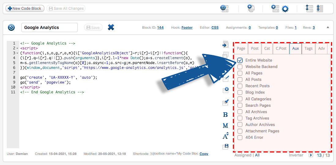 Say you wanted to add Google Analytics tracking code to your site.
