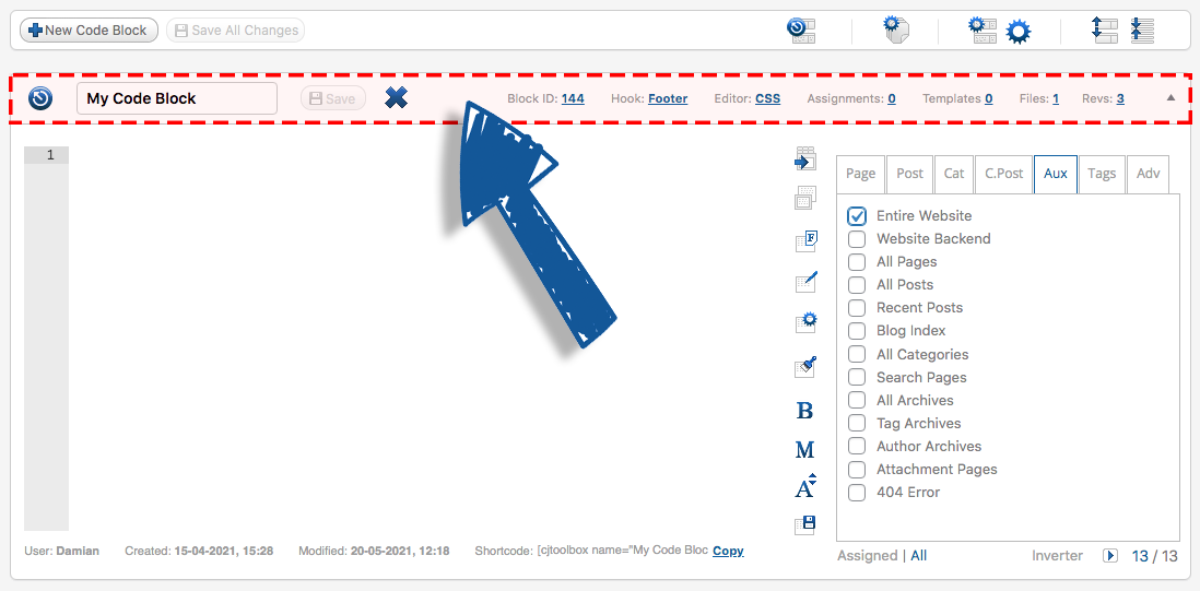 - Assign code blocks to run site-wide OR to only run on specific sections of your site such as pages, posts, categories, etc